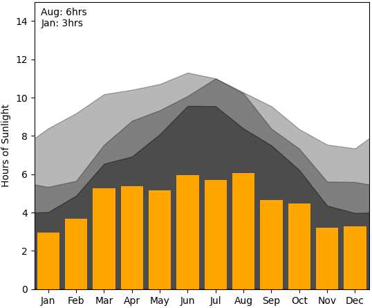 If data is available, the next graph shows either the daily average number of hours of sunshine received by the station each month or the average amount of water than evaporates from an evaporation pan. Whether directly measuring hours of collected sunlight or water evaporated by sunlight, this plot gives an indication of both hours of daylight and typical cloudiness during the day. Obviously, the number of hours of sunshine received is measured in hours. The amount of water evaporated is measured in inches. Again, the top left corner shows the months with the maximum and minimum values.