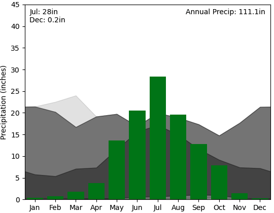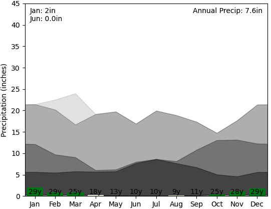 Again, the top corners of the graph display text relevant to the data. The top left corner displays the months with the most and least accumulated rainfall. Where the accumulated rainfall is over an inch, the value displayed is rounded to the nearest inch. For lower amounts, the average accumulation is rounded to the nearest tenth of an inch. The top right corner of the graph shows the annual average precipitation that occurs, and is a sum of the twelve months.