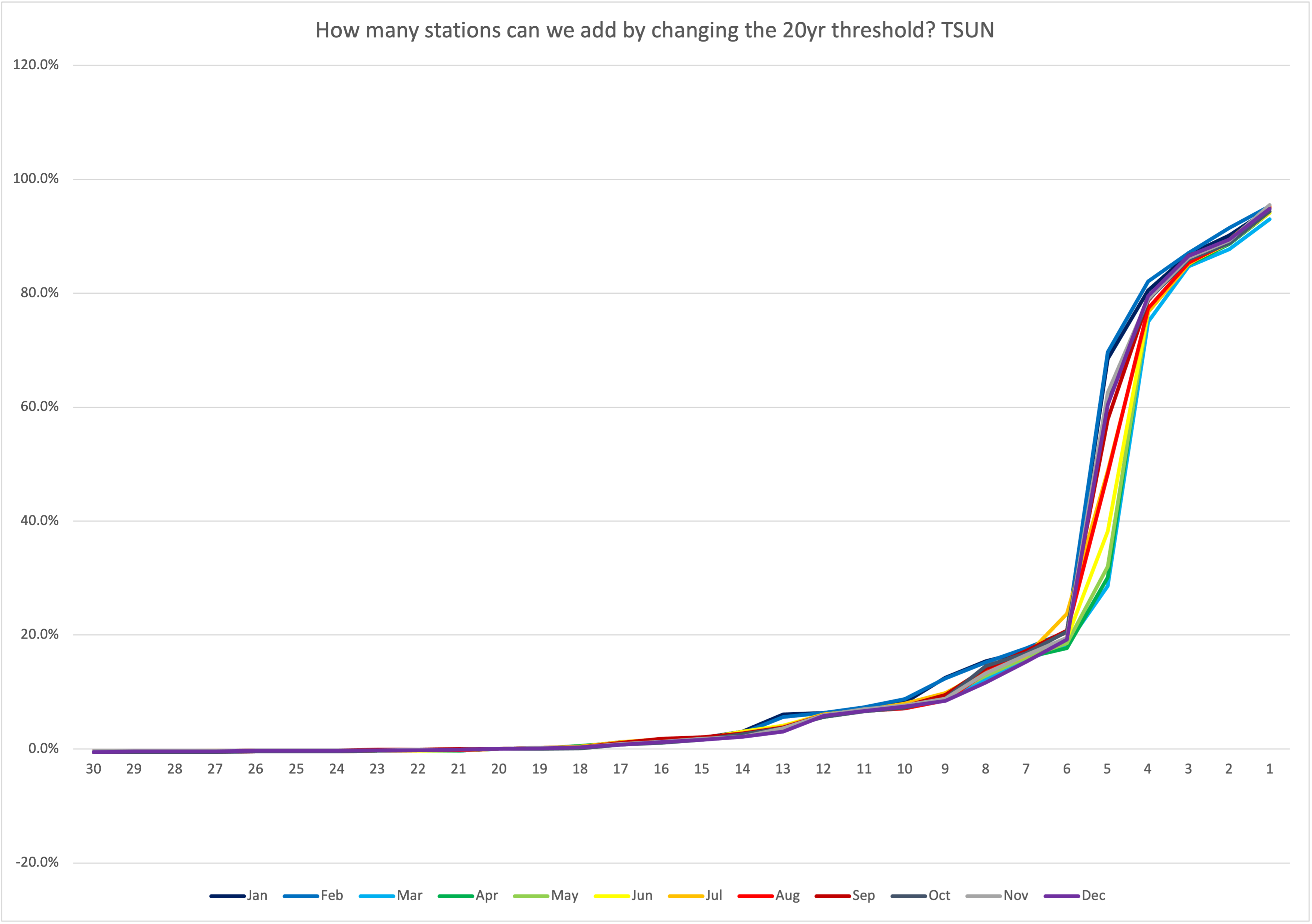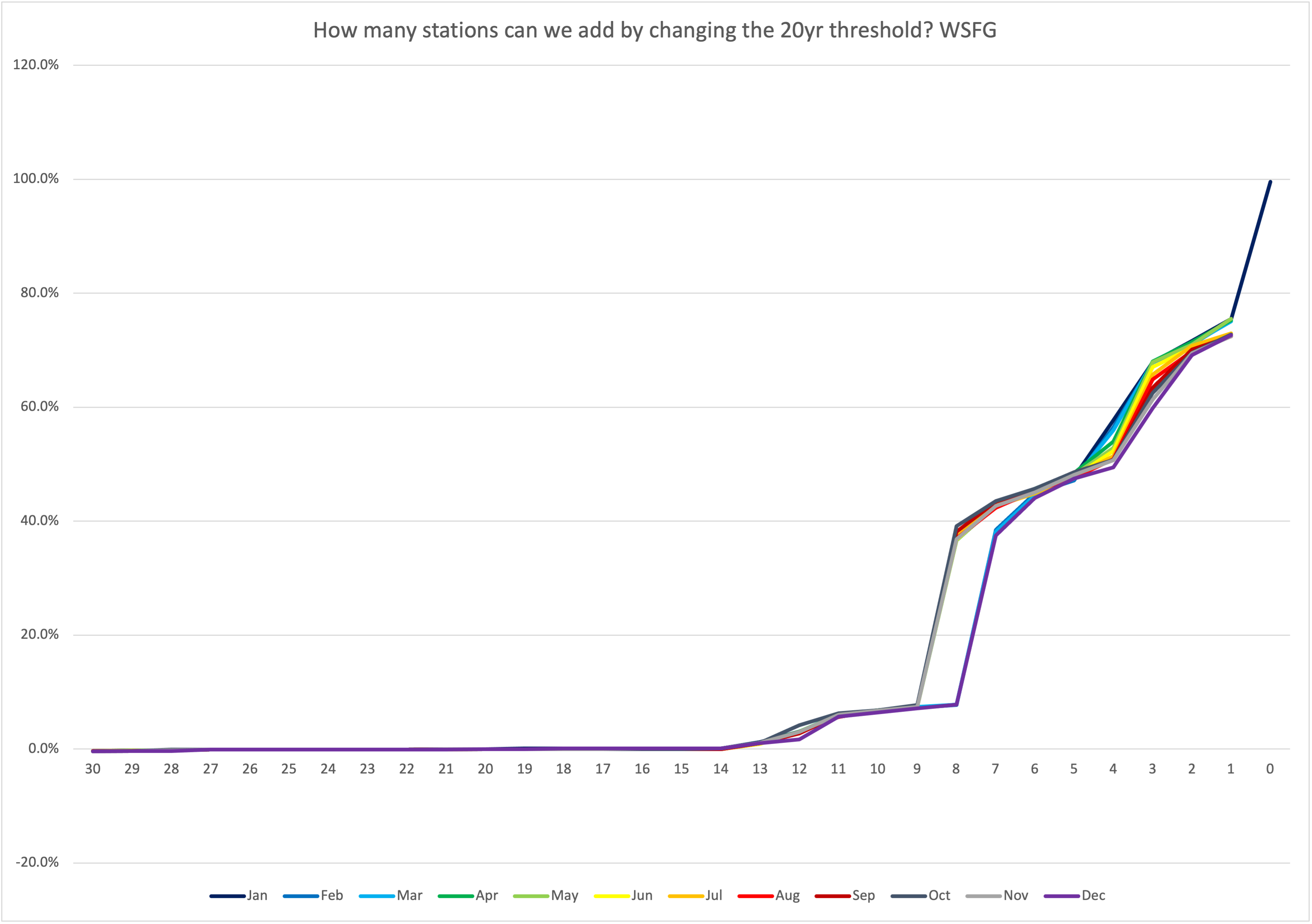This graph was created to find how many more stations could feature a graph for hours of sunshine simply by changing the threshold for the number of years of data that has beeen collected. To determine if adjusting the threshold would be worthwhile, the y-axis is normalized by the number of stations featuring this graph using the 20-year threshold, which is a fancy way of saying this is why the y-axis is a percent. The different colors show which months contain many years of data in case a systematic trend appears. The conclusion is very few stations have been recording this data for even 6 years, and almost none have done so for 14 years, much less 20 years. Most stations recording wind speed gusts have only been doing so for six years.