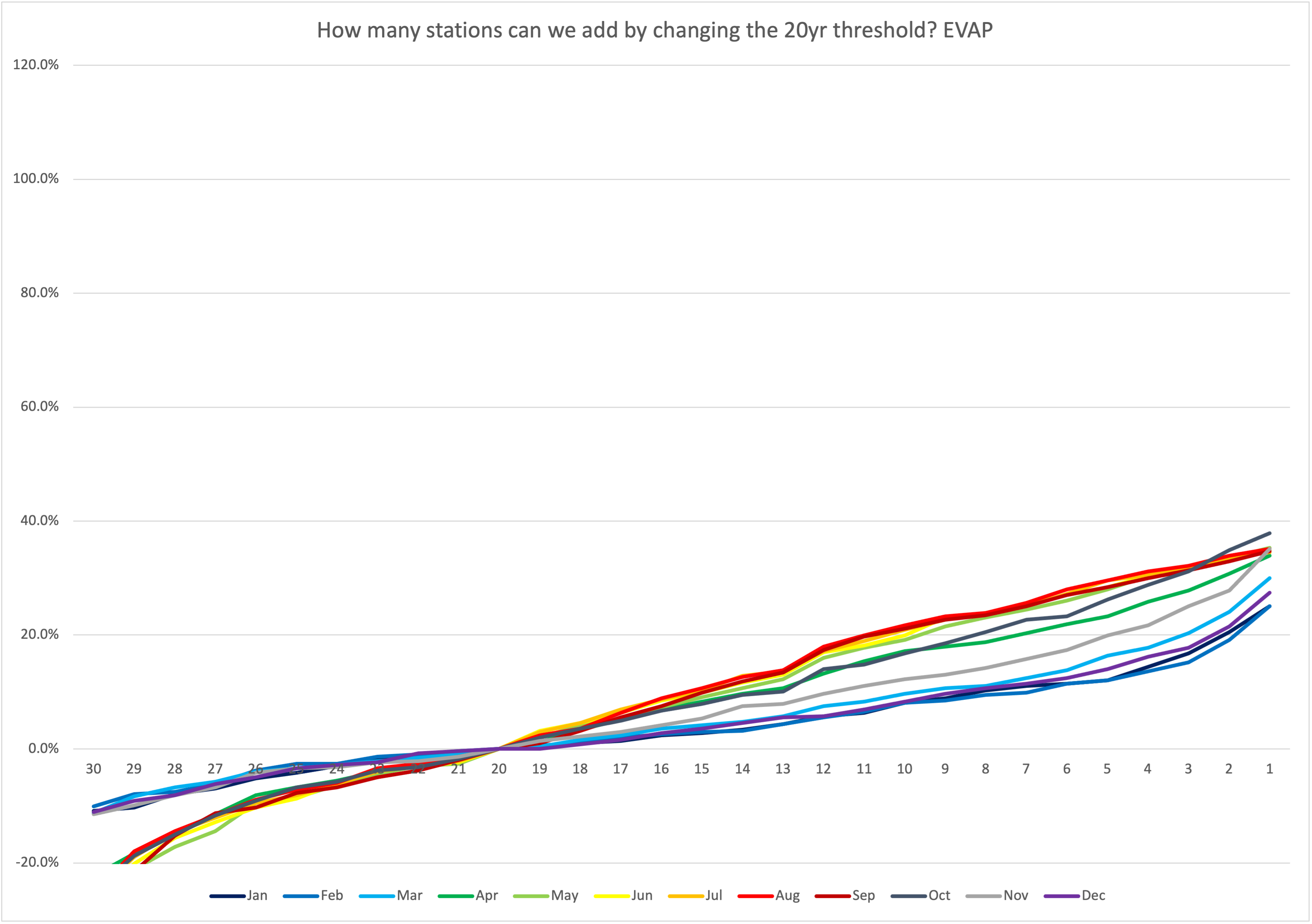 There is not a clear drop off to indicate when data collection for water evaporation clearly began. But more data is clearly available in the summer months, likely because water may freeze in the winter. Therefore, requiring a minimum of 20 years of data for these measurements would result in these plots being very rare. It would also make the concept of regional and worldwide comparisons impossible. So lower thresholds of 4, 6, and 15 years were used for these three datasets. Undoubtedly, fewer years of data means there is more noise in the data, but it's better than no data at all.