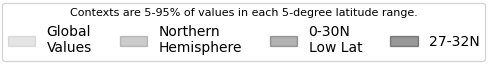 Directly under the location is a legend. To provide some context to the values shown for each station, four ranges of data are shown for all stations at similar latitudes. This context shown in grayscale is plotted behind the station's values, which are shown in colors.Temperatures are red.