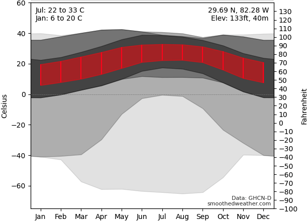 In addition to the data plotted in red and gray, the top corners of the graph display text relevant to the station. The top left of the plot shows specific temperature values associated with the warmest and coldest months of the year, and in which months they occur. Specifically, the first line shows data for the month with the highest maximum temperature over the year. The bottom line shows data for the month with the lowest minimum temperature over the year.If only the average temperature is available instead of the maximum and minimum temperatures, then only the highest and lowest average temperature is displayed.