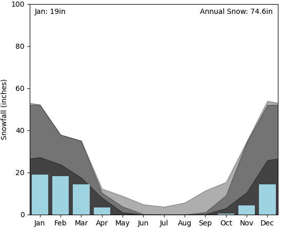 If data is available, the next graph shows the average snowfall the station receives each month. Similar to the precipitation graph, the top left corner displays the month with the most accumulated snowfall,The minimum value is zero for the vast majority of stations and occurss in multiple summer months. and the top right corner shows the annual average snowfall.